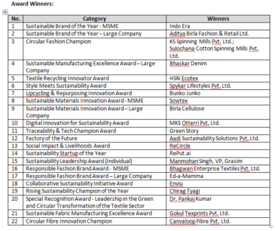 The Jury for the awards included stalwarts like Dr. Naresh Tyagi, CSO, ABFRL; Sanjay Rastogi, Business Head, Trent Ltd.; Radhika Kaul, Chief of Staff, UN RCO India; Manohar Samuel, SU.RE; Parvinder Kadyan, Chairman, GATS; Naveen Sainani, Hon. Gen. Secretary & Chairman, ESG at CMAI; Ankur Gadia, Vice President, CMAI; Darshana Gajare, Head of Sustainability, Lakmé Fashion Week, SU.RE, Circular Design Challenge; and Prof. (Dr.) Meenakshi Tomar, Vice Dean, Jindal Global Business School.
